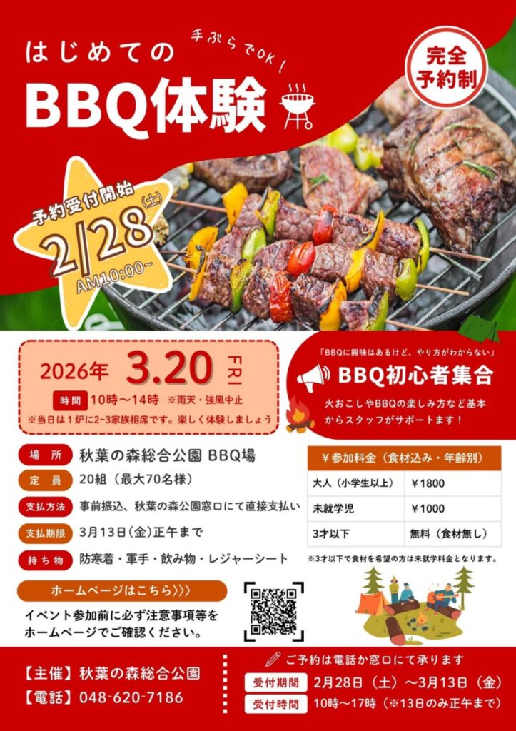 3月1日より、BBQ場の利用を開始しています。ご利用については、現地管理棟窓口にて「利用者登録」を済ませ、「さいたま市公共施設予約システム」からのお申し込みが必要です。利用月の3ヶ月前の申し込みとなります。空きがある場合 […]