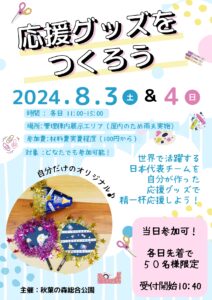 2024.07.23 イベント【夏休みイベント 第1弾】8/3(土)&8/4日 応援グッズを作ろう!世界で活躍する 日本代表チームを 自分が作った応援グッズで 精一杯応援しよう! 当日参加可能、先着50名様ずつ、参加費100円、どなたでも参加可能です。涼しい管理棟展示エリアで楽しんでくださいね。 お問合せ電話番号 04 […]