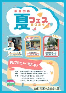 2024.07.24 イベント【夏休みイベント 第2弾】8/3(土)〜8/15(木)秋葉の森 夏フェス2024フィッシング型くじ引き シャボン玉あそび 水あそび 公園管理棟前のエリアが遊び場になります。 くじ引きのみ有料(1回400円)、シャボン玉あそびとみずあそびは無料です。 お問合せ電話番号 048-620-7186