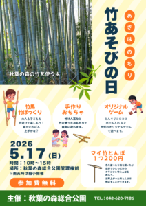 大人もこどもも、みんなで楽しめるイベント。秋葉の森総合公園に生えていた竹を使って、さまざまな遊びが出来るスペースをご用意します。参加費は無料です。(一部ワークショップは有料)