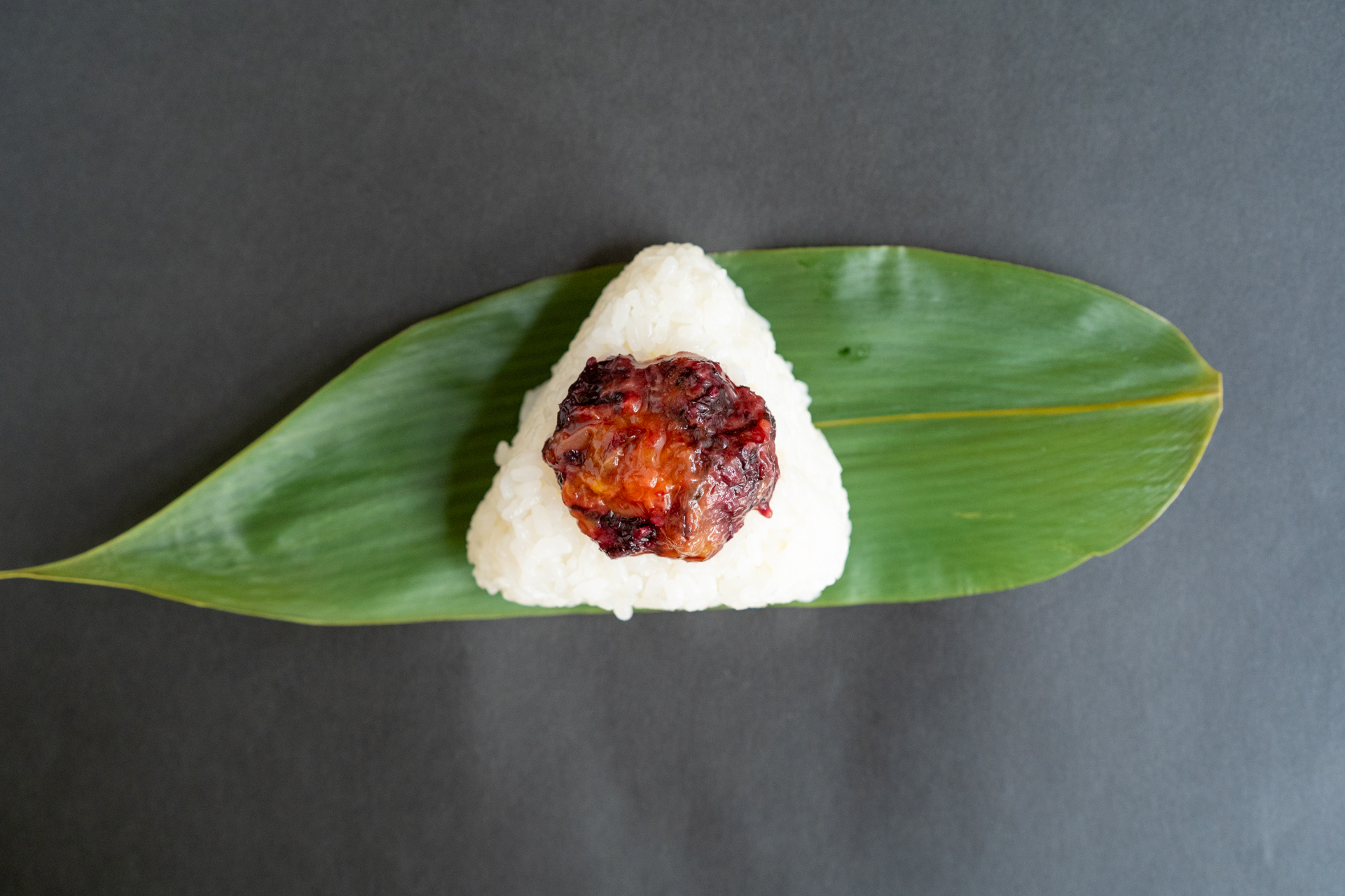 和歌山の梅干し店、『みやぶん』から仕入れた、かつお梅を使っております。このかつお梅に、しその葉を混ぜ合わせることによりより梅干しの味を引き立てました。