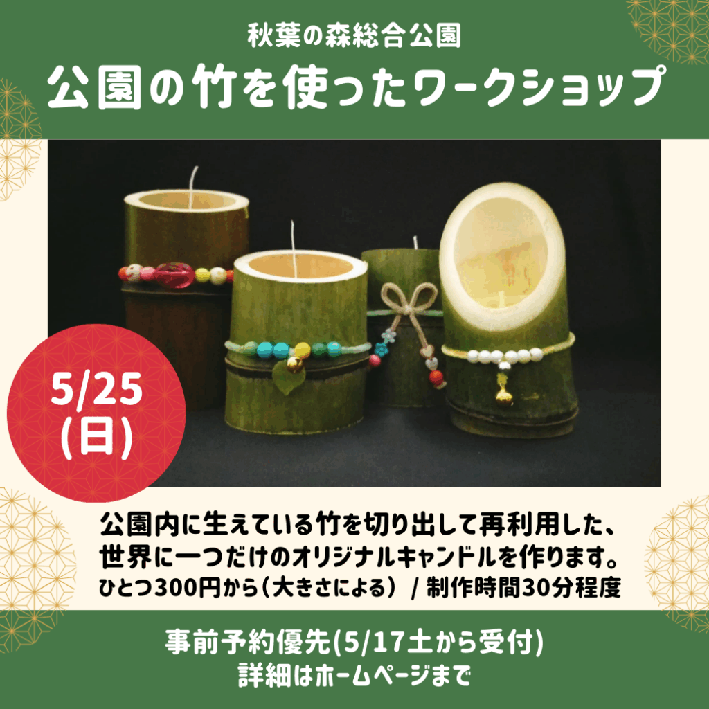 秋葉の森総合公園内に生えている竹を切り出して再利用した、世界に一つだけのオリジナルキャンドルを作ります。