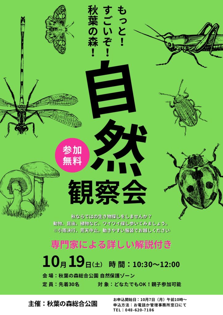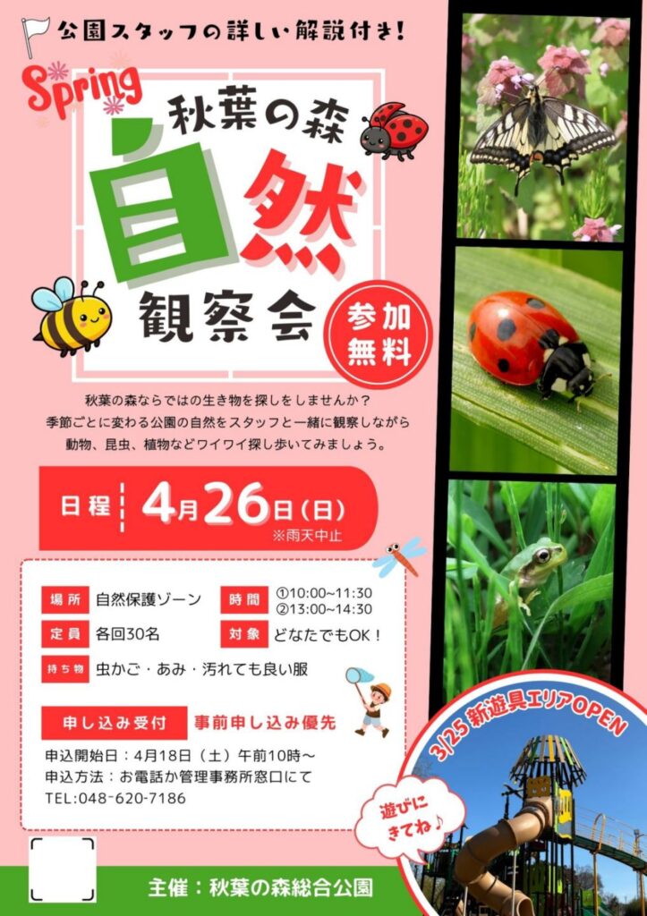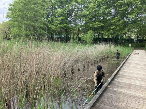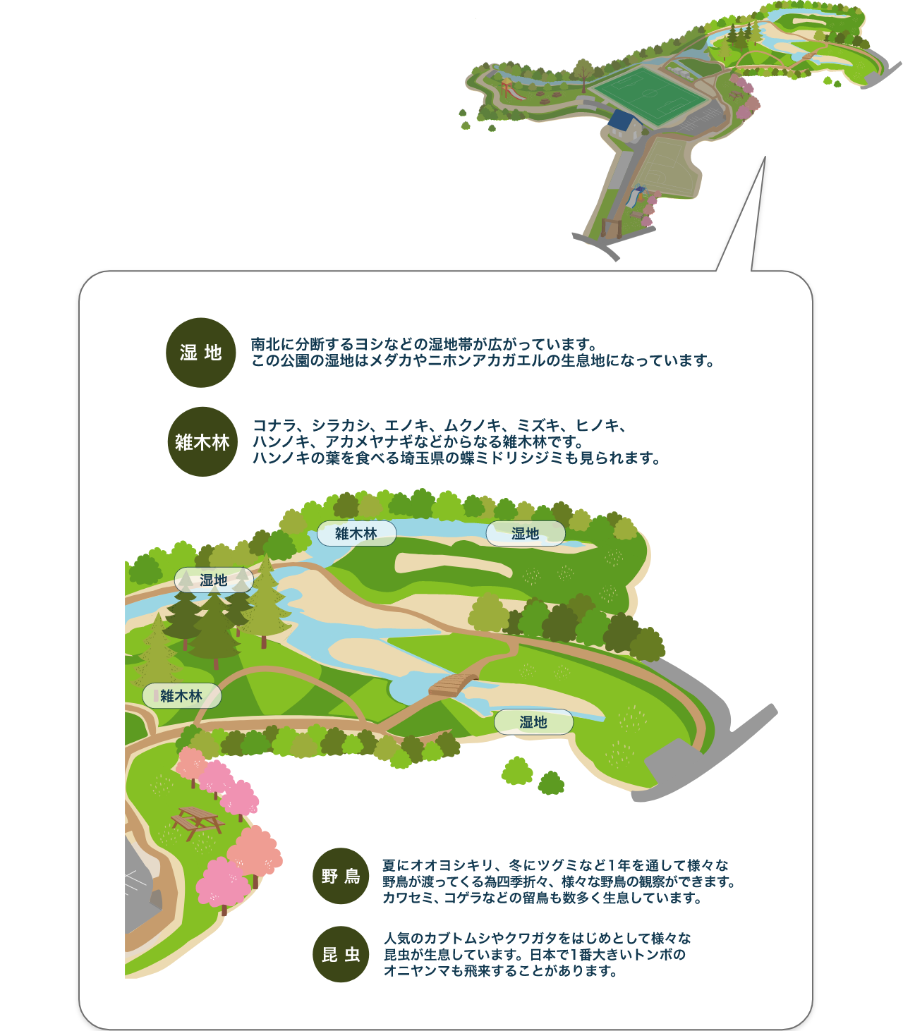湿地、水路、斜面林等の環境が集約する秋葉の森総合公園の保護エリアで、多くの種類の生物が暮らしています。