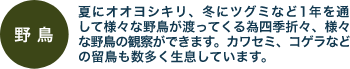 野鳥の鳴き声を聞く、生物観察など、五感を使って楽しむことが出来ます。